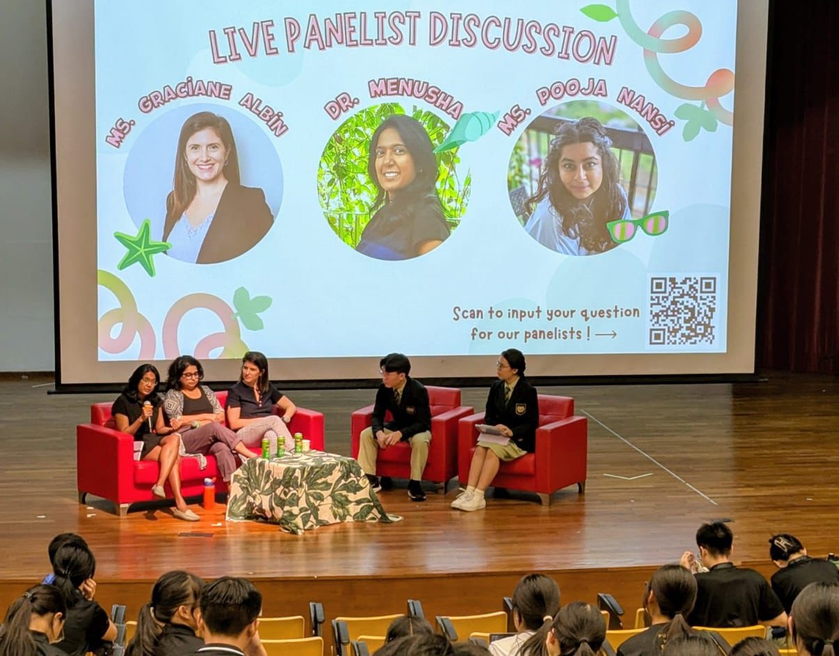 THP students with our panelists Ms Graciane Albin, Dr. Menusha De Silva, and Ms Pooja Nansi during our HumaniTEA Conference in 2025.
